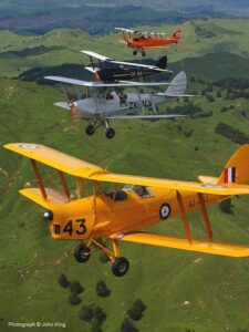 The Tiger Moth was introduced to New Zealand both as an Air Force trainer and as a training aircraft at Club level. With the Second World War looming, production was started at De Havilland NZ’s plant at Rongotai, Wellington. Under the Commonwealths Elementary Flying Training School (E.F.T.S.) scheme, thousands of pilots, not only Kiwis, were trained in New Zealand at various airfields. In total, 345 DH82’s were built at Rongotai, establishing a solid base for the survival of the Tiger Moth into the modern era.
